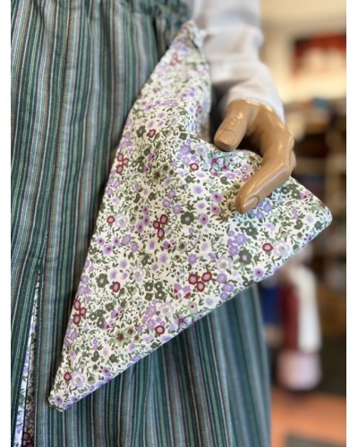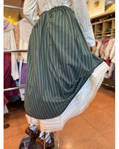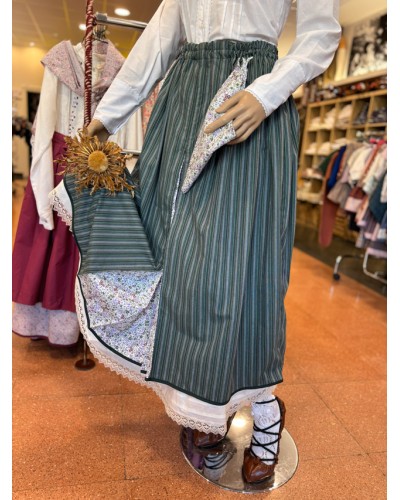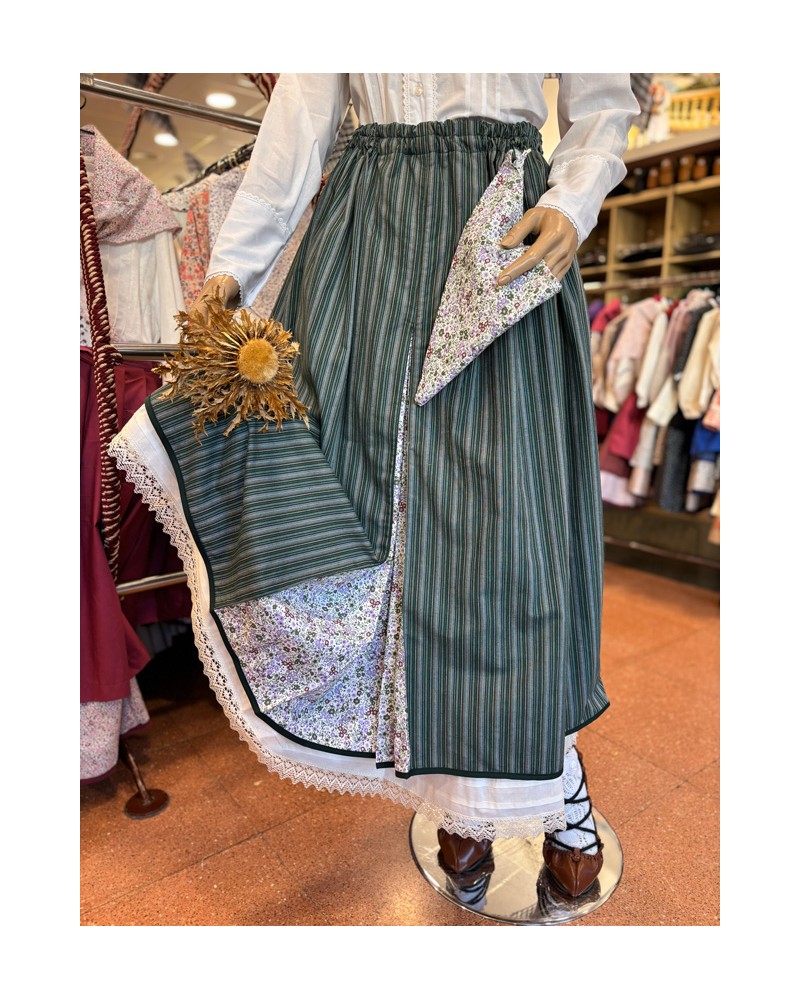 Falda vasca en tono verde, confeccionada en tejido listado y acompañada de pañuelo floral incluido que aporta un contraste suave y natural al conjunto. Un diseño muy ligado a la estética tradicional vasca.