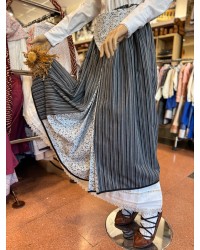 La falda combina tejidos en rayas verticales grises con panel frontal estampado, generando contraste visual y movimiento. El pañuelo incluido, confeccionado en el mismo tejido que la falda, refuerza la coherencia del diseño y permite llevar el conjunto completo listo para lucir en euskal jaiak, romerías, fiestas patronales o eventos culturales.