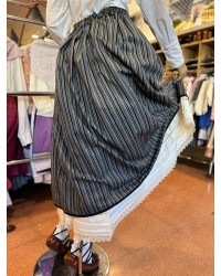 Esta falda vasca en tonos negros y grises se caracteriza por su estética sobria y atemporal, realzada por la presencia de un pañuelo interior de flores incluido que rompe la uniformidad del conjunto con un contraste discreto y elegante. La combinación de rayas y estampado floral refleja una forma clásica de vestir el traje vasco femenino.