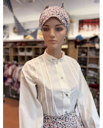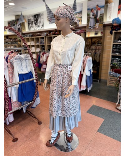 Conjunto completo de ropa tradicional vasca diseñado para representar con fidelidad la estética del traje vasco de mujer. Incluye blusa blanca de estilo tradicional, falda de corte largo con caída elegante, delantal estampado floral que aporta un toque característico y pañuelo coordinado que refuerza el conjunto de euskal jantziak.