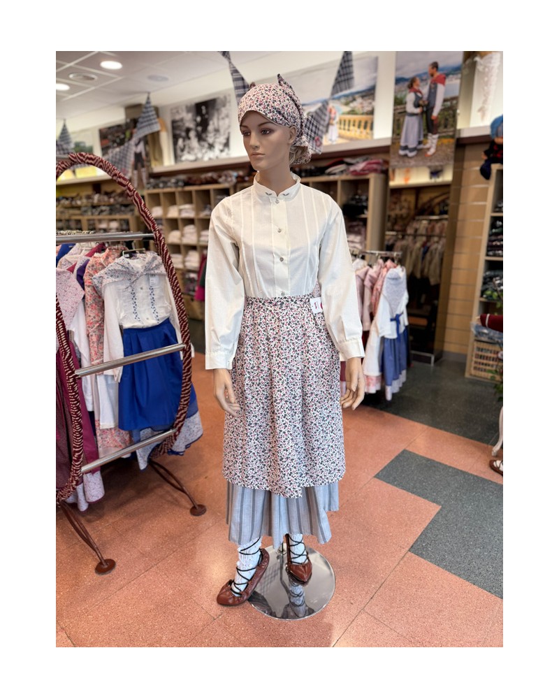 Auténtico conjunto de traje tradicional vasco para mujer con blusa blanca, falda clásica, delantal estampado floral y pañuelo a juego, ideal para euskal jantziak y fiestas vascas.