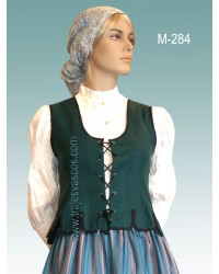 Este corpiño de aldeana está confeccionado en fieltro fino de color turquesa oscuro esta rematado en ondas y cerrado mediante cordón de algodón y ojeteras metálicos, es una prenda de vestir muy elegante que combina a la perfección con nuestras blusas en color crudo con volantes y nervios en las mangas y con faldas rayadas.