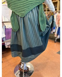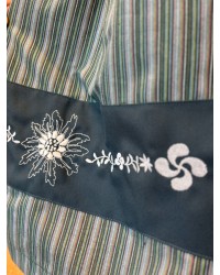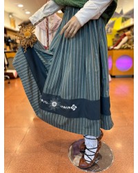 Esta falda vasca verde destaca por su tejido listado de inspiración tradicional y por el cuidado bordado inferior con lauburu y eguzkilore, dos símbolos profundamente ligados a la cultura vasca. Su diseño aporta movimiento, armonía y un acabado muy elegante, manteniendo la esencia de los trajes regionales de siempre.