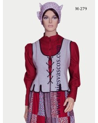 Su diseño entallado realza la silueta sin perder comodidad, con botones frontales y acabados cuidados que respetan la estética clásica del traje vasco femenino. Es una prenda equilibrada, elegante y muy fácil de combinar con falda tradicional y delantal.