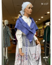 Traje tradicional vasco de mujer compuesto por falda azul con eguzkilores bordados, corpiño gris de ondas, blusa con laburus bordados en gris, toquilla triangular azul y pañuelo para la cabeza. Un conjunto completo de euskal jantziak inspirado en la indumentaria tradicional de Euskal Herria.
