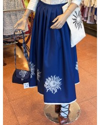 Falda de corte clásico en tono azul profundo, decorada con el símbolo vasco del eguzkilore, representación ancestral de protección en la tradición popular. El motivo aparece estampado con gran detalle, destacando sobre el tejido y aportando un aire elegante y auténtico.