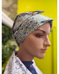 Pañuelo vasco para la cabeza con estampado floral en tonos azules, verdes y amarillos. Modelo ya confeccionado para colocarlo fácilmente y completar trajes vascos tradicionales y conjuntos de euskal jantziak.
