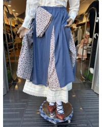 La falda presenta un diseño en tono azul con aperturas decoradas con tejido floral que añade contraste y movimiento al traje. Además, la propia falda incluye un pañuelo a juego pensado para completar el conjunto siguiendo la estética tradicional de la vestimenta vasca.
