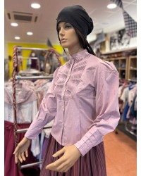 Blusa vasca rosa de estilo tradicional con lorzas decorativas en la pechera. Un diseño clásico y elegante, ideal para completar trajes vascos y conjuntos de casera.