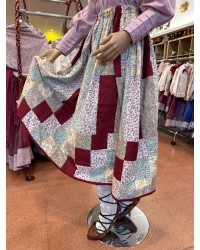 Falda tradicional vasca de estilo patchwork en tonos granates con estampado floral, diseñada para complementar trajes vascos auténticos. Una pieza vistosa y elegante dentro de la indumentaria tradicional vasca, ideal para fiestas, romerías y eventos culturales.