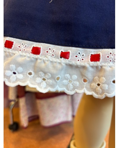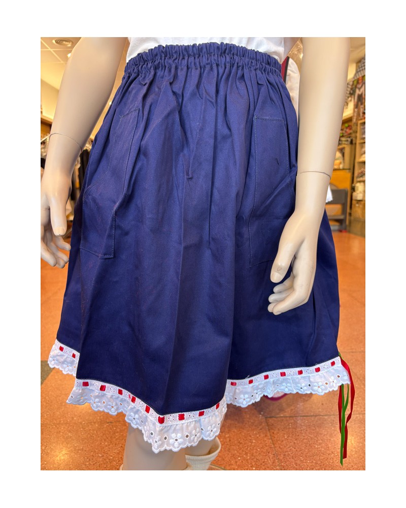 Falda confeccionada con tejido de Mahón en color azul, rematada con puntilla blanca, lazo rojo, lazo verde y lazo blanco.