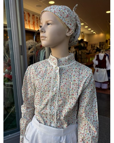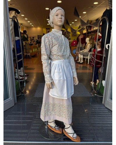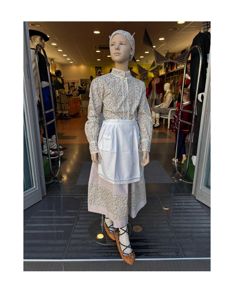 Conjunto tradicional para niña formado por blusa estampada, falda combinada, pañuelo y delantal clásico. Perfecto para fiestas vascas, eventos escolares y actos culturales.