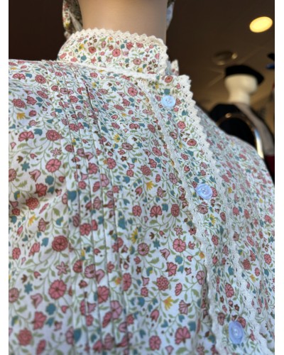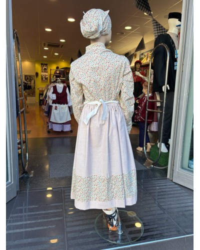 La blusa con estampado pequeño, un diseño muy típico en la indumentaria tradicional, aporta un aire dulce y atemporal. La falda, compuesta por franjas lisas y estampadas, ofrece un movimiento natural y un acabado artesanal que realza el conjunto. El delantal, de estilo sencillo y limpio, aporta un toque tradicional imprescindible. El conjunto se completa con un pañuelo a juego, que armoniza con la blusa y aporta unidad visual.