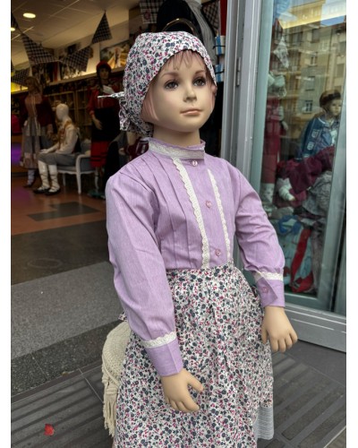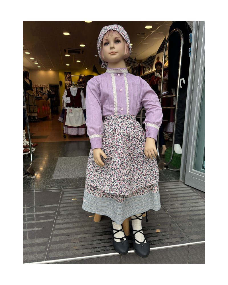 La blusa rosa palo, decorada con puntillas en el frontal, cuello y puños, aporta un acabado delicado y muy cuidado. La falda, con estampado floral y franjas inferiores a rayas, crea un contraste armonioso y añade movimiento al conjunto. El pañuelo estampado completa el look y aporta cohesión visual con los tonos y motivos del resto del vestuario.