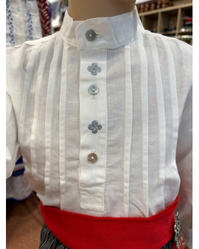 Camisa tradicional vasca infantil confeccionada en tejido blanco, diseñada específicamente para formar parte del traje vasco de niño dentro de los euskal jantziak. Destaca por sus finos lauburus bordados en color gris en la zona central del pecho, un símbolo icónico de la cultura vasca que aporta identidad y carácter al conjunto.