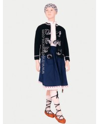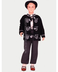 Este traje vasco infantil con mendigozal negro recrea una de las combinaciones más representativas de la indumentaria del casero / baserritarra. El contraste entre el gerriko rojo y el pantalón de rayas aporta carácter y mantiene la estética tradicional que tantas familias eligen para vestir a sus niños en fechas señaladas del calendario euskaldun.
